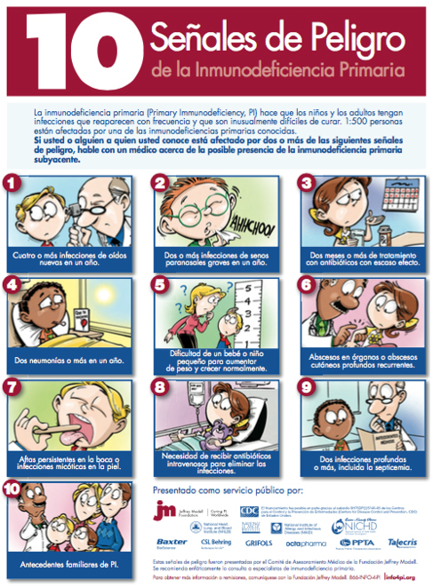 - INFECCIONES: que pueden ser graves, de repetición, en sitios como oído, senos paranasales, que se presenten como neumonía, diarrea ó infección de la piel, infección generalizada (sepsis), que requieran hospitalización, antibióticos múltiples o intravenosos, que infecten gérmenes poco comunes.